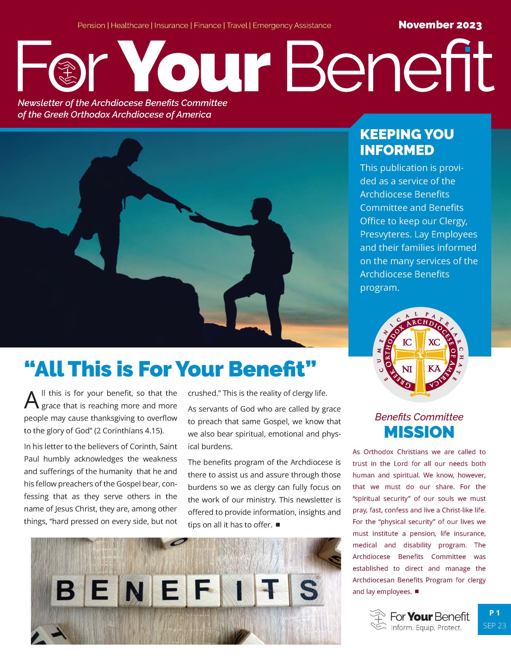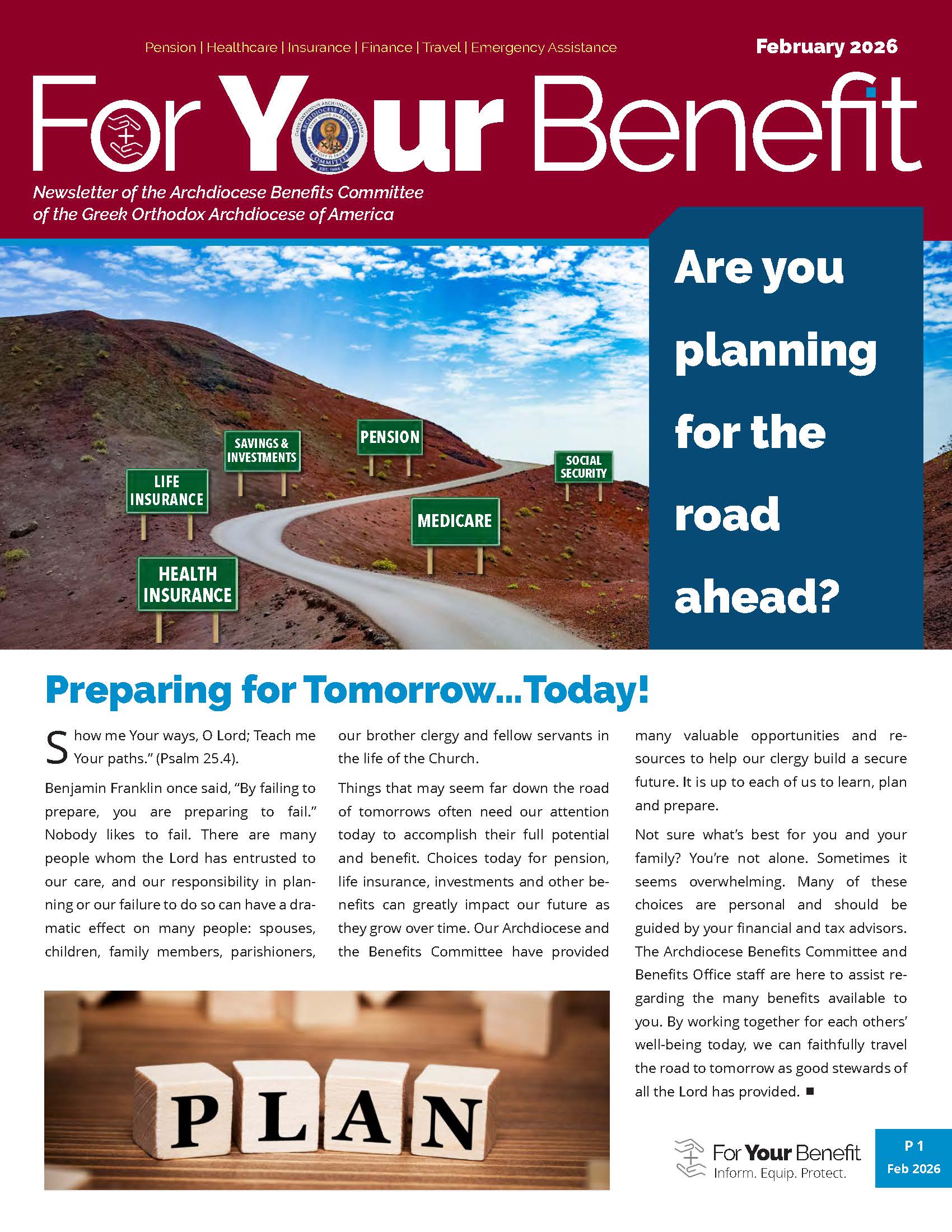 The For Your Benefit newsletter is the official publication of the Archdiocese Benefits Committee (ABC) of the Greek Orthodox Archdiocese of America. Provided as a service of both the Benefits Committee and the Benefits Office, it keeps our Clergy, Presvyteres, Lay Employees, and their families informed about the many services and resources offered through the Archdiocese Benefits Program.
